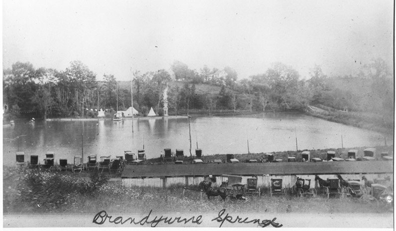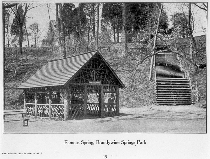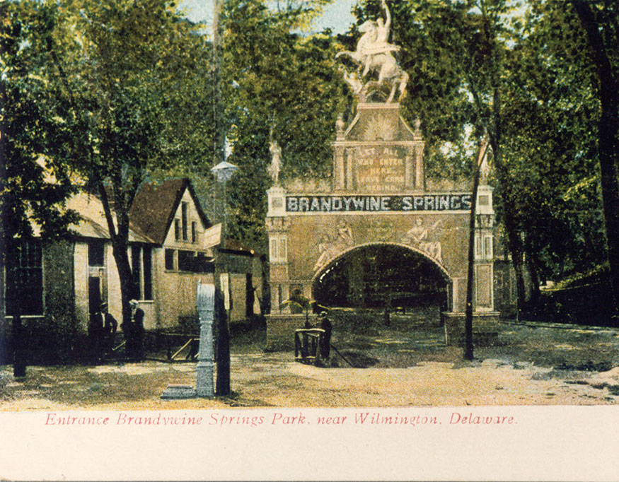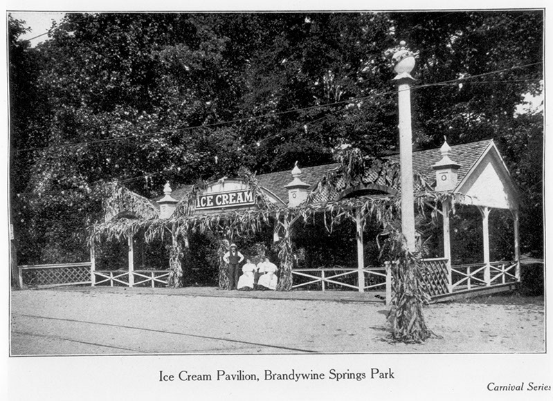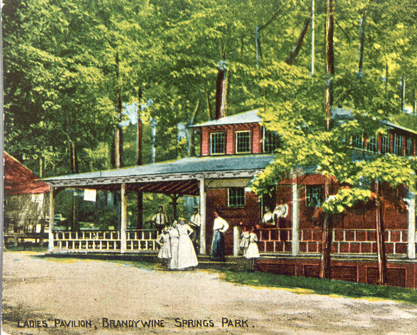 In 1891, an agreement by Richard Crook was made with the B&O Railroad to allow them to erect a station in the park. This photo is from a George Wolf postcard of the era and is the only photo we have. Note on the postcard it is called a pavilion so we have kept that designation. The Wilmington & Western Railroad calls it a station. Credit: from the FOBS collection