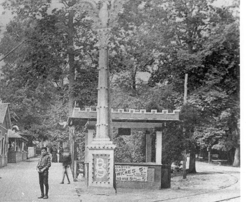The boy in the photo is standing on the Boardwalk, and the view looks west. The Peoples Railway line runs directly past and then around the Food Stand. Credit: from the FOBS collection
