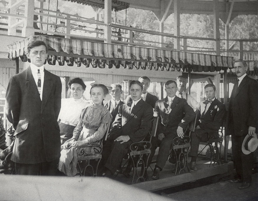 This photo shows the Lake before the 1911 improvements, which included construction of the islands and Dance Hall. On the far side of the Lake is the gypsy camp where Mrs. Worth told the fortunes of park visitors. In the foreground: the personal transportation of the day.