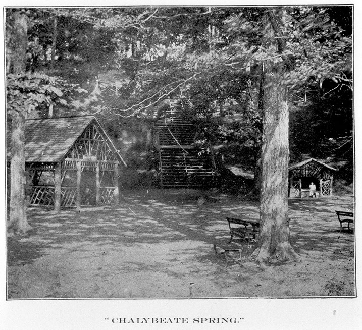 The spring was located in the hut-like structure on the left. The stairs leading up to the Hotel can be seen on the right.