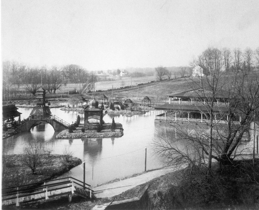 This photo looks northwest and shows the Hungarian Village (left) and the Dance Hall (right). Above the Hungarian Village, the tracks of the West Chester, Kennett & Wilmington Electric Railway recede in the distance. Credit: from the FOBS collection