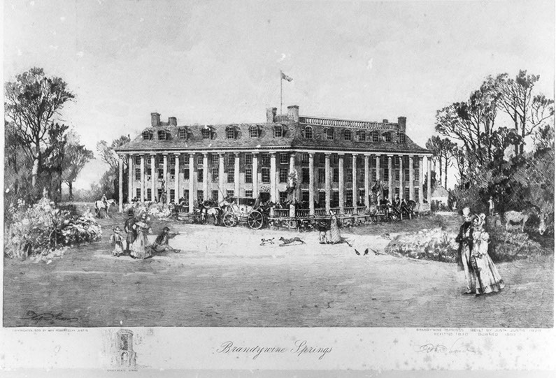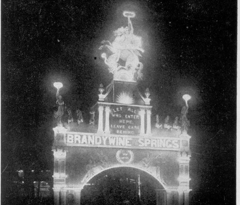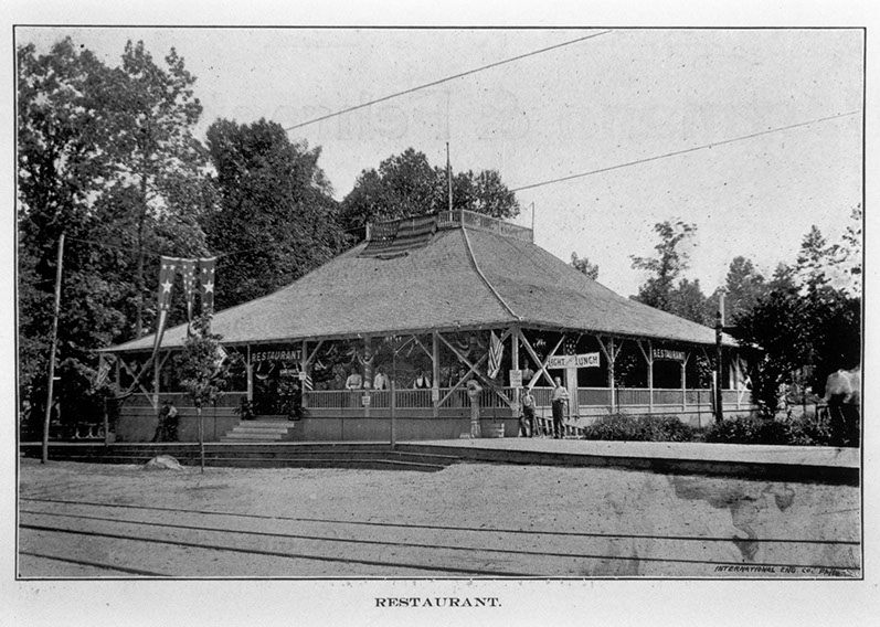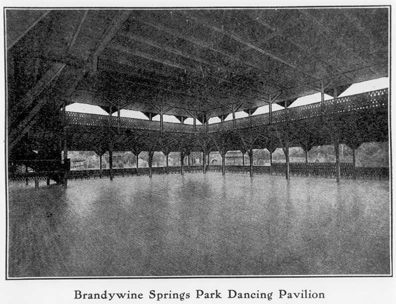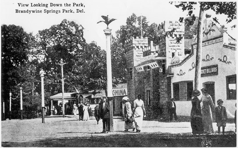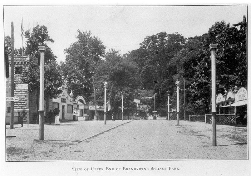 This photo looks northwest and shows the Hungarian Village (left) and the Dance Hall (right). Above the Hungarian Village, the tracks of the West Chester, Kennett & Wilmington Electric Railway recede in the distance. Credit: from the FOBS collection