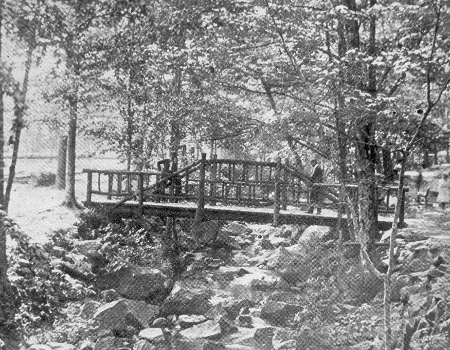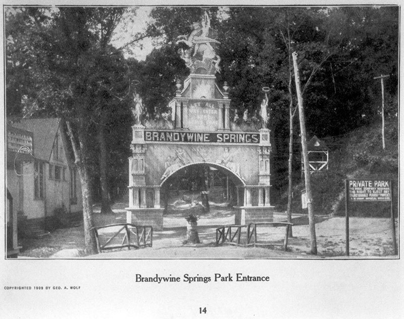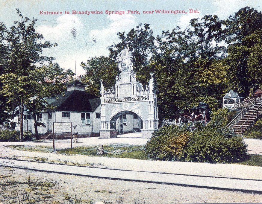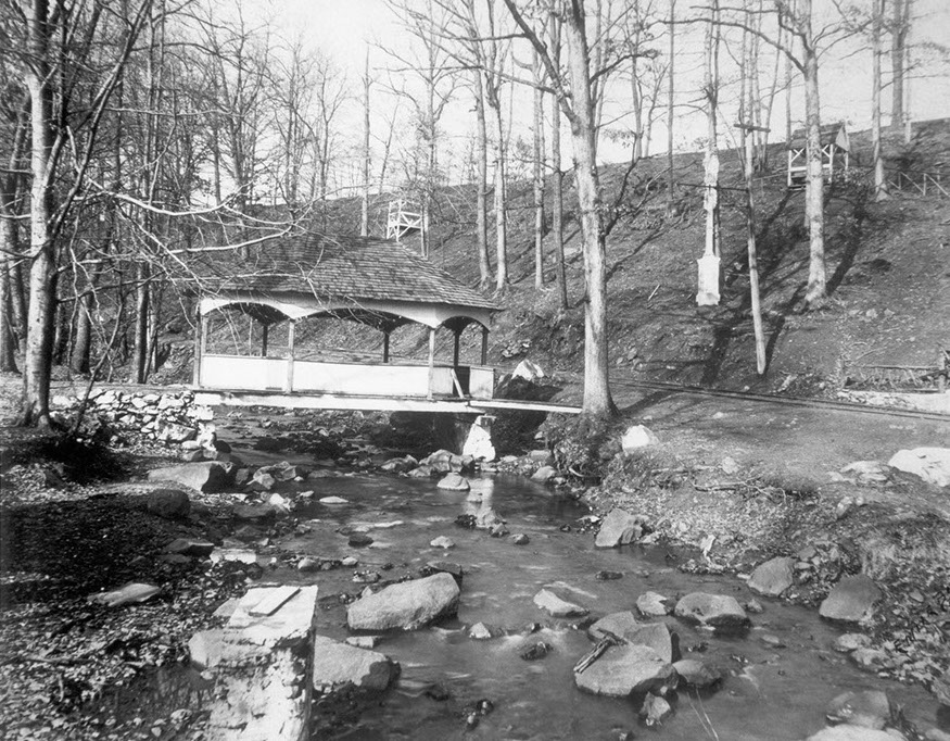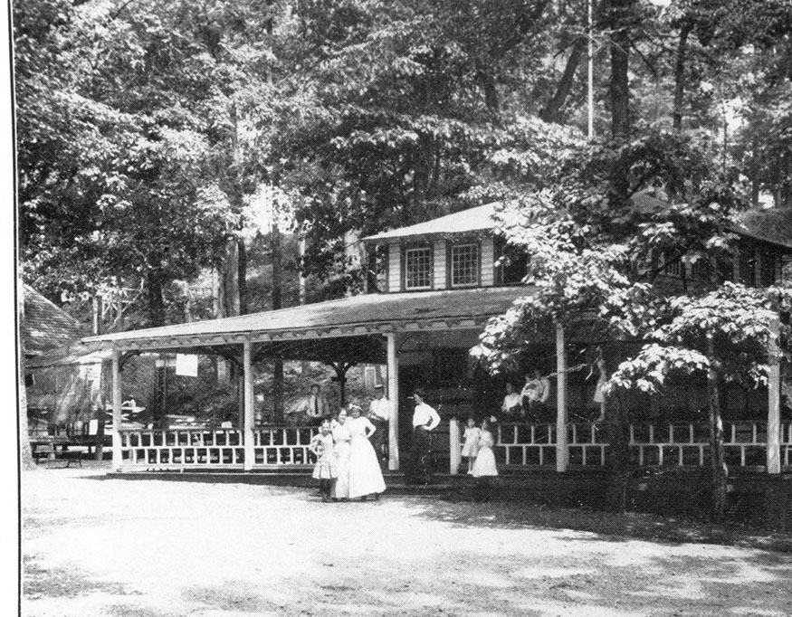 In 1891, an agreement by Richard Crook was made with the B&O Railroad to allow them to erect a station in the park. This photo is from a George Wolf postcard of the era and is the only photo we have. Note on the postcard it is called a pavilion so we have kept that designation. The Wilmington & Western Railroad calls it a station. Credit: from the FOBS collection