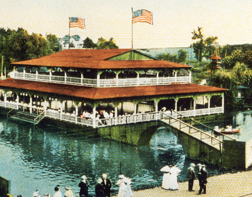 This photo shows the Lake before the 1911 improvements, which included construction of the islands and Dance Hall. On the far side of the Lake is the gypsy camp where Mrs. Worth told the fortunes of park visitors. In the foreground: the personal transportation of the day.