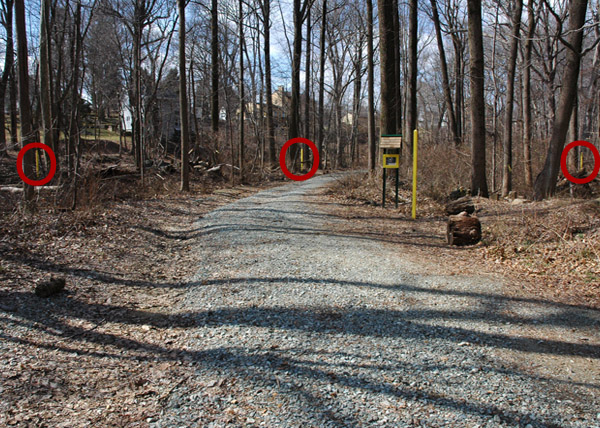 After an investigation, we erected four yellow building corner posts and sign to show visitors the size of the Exhibit Hall. The red circles indicate the three posts farthest from the camera, and the sheer size of the building. Credit: Photo by Mike Ciosek.